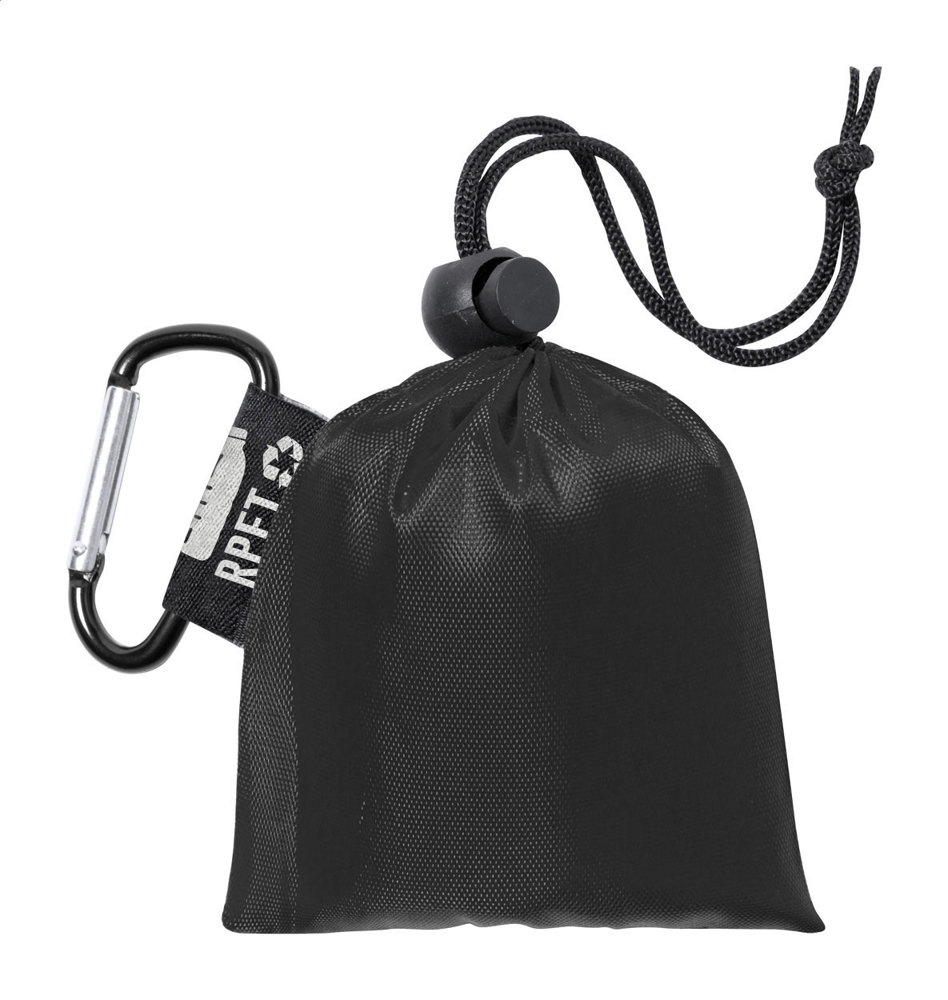 Transparenter Poncho aus LDPE in Einheitsgröße für Erwachsene. In RPET-Polyester-Tragetasche, mit Aluminiumkarabiner. Mit RPET-Label.