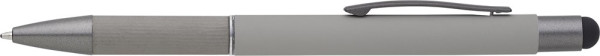 Aluminiumkugelschreiber mit Details aus gerolltem Papier am Griff. Gummispitze für kapazitive Bildschirme. Blaue Tinte.