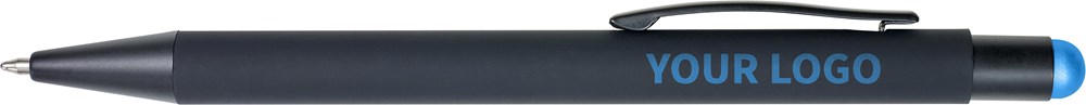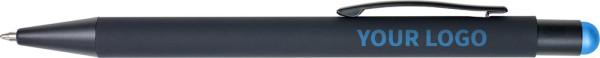 Gummierter schwarzer Kugelschreiber 'Formentera' mit Touch-Funktion. Der Schaft ist unter der Oberfläche in der Farbe des Touchpens lackiert, sodass diese beim Lasern zum Vorschein kommt. Mit blauer Mine.