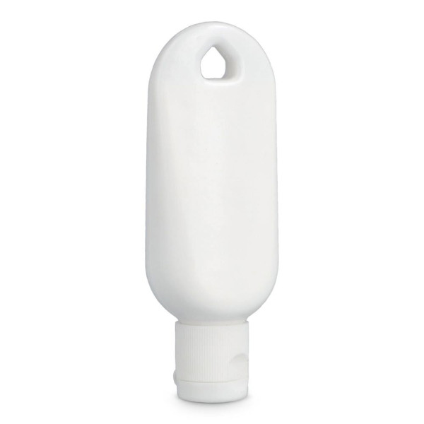 Diese kompakte Sonnencreme, ist perfekt für einen Tag am Strand oder auf einem Festival. Dank der runden Öffnung, können Sie die Flasche einfach an einem Schlüsselbund oder eine Tasche befestigen. Der Aufkleber kann vollfarbig bedruckt werden.