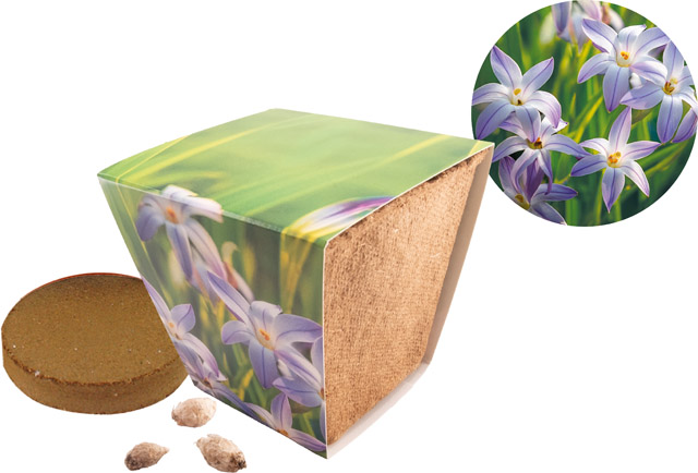 Inhalt: Kokosfaser-Topf, Erdtablette, Samen: Sternblumenzwiebelchen