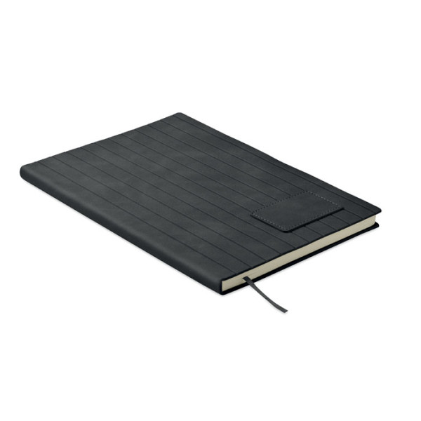 DIN A5 Notizbuch mit geripptem Soft Cover aus 40% recyceltem Post Consumer Smokey PU und 60% PU mit PU Patch. 80 Blatt (160 Seiten) 70 g/m² Recyclingpapier. Farblich passendes Lesebändchen.