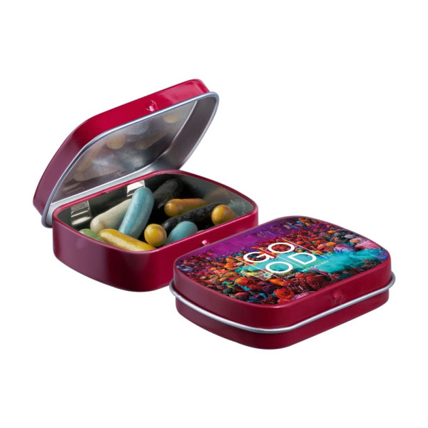 Mini weiße Klappdeckeldose mit ca. 23 Gramm Mini Choco's, vollfarbig bedruckt. Inklusive Inhaltsstoffaufkleber und eingeschweißt.