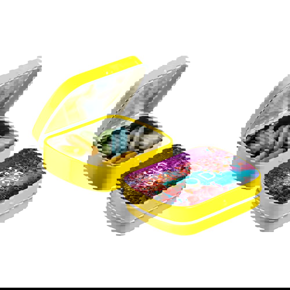 Mini weiße Klappdeckeldose mit ca. 23 Gramm Mini Choco's, vollfarbig bedruckt. Inklusive Inhaltsstoffaufkleber und eingeschweißt.
