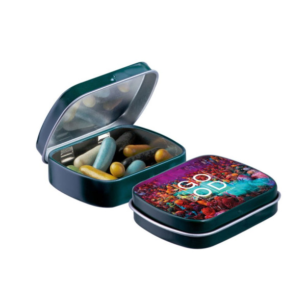 Mini weiße Klappdeckeldose mit ca. 23 Gramm Mini Choco's, vollfarbig bedruckt. Inklusive Inhaltsstoffaufkleber und eingeschweißt.