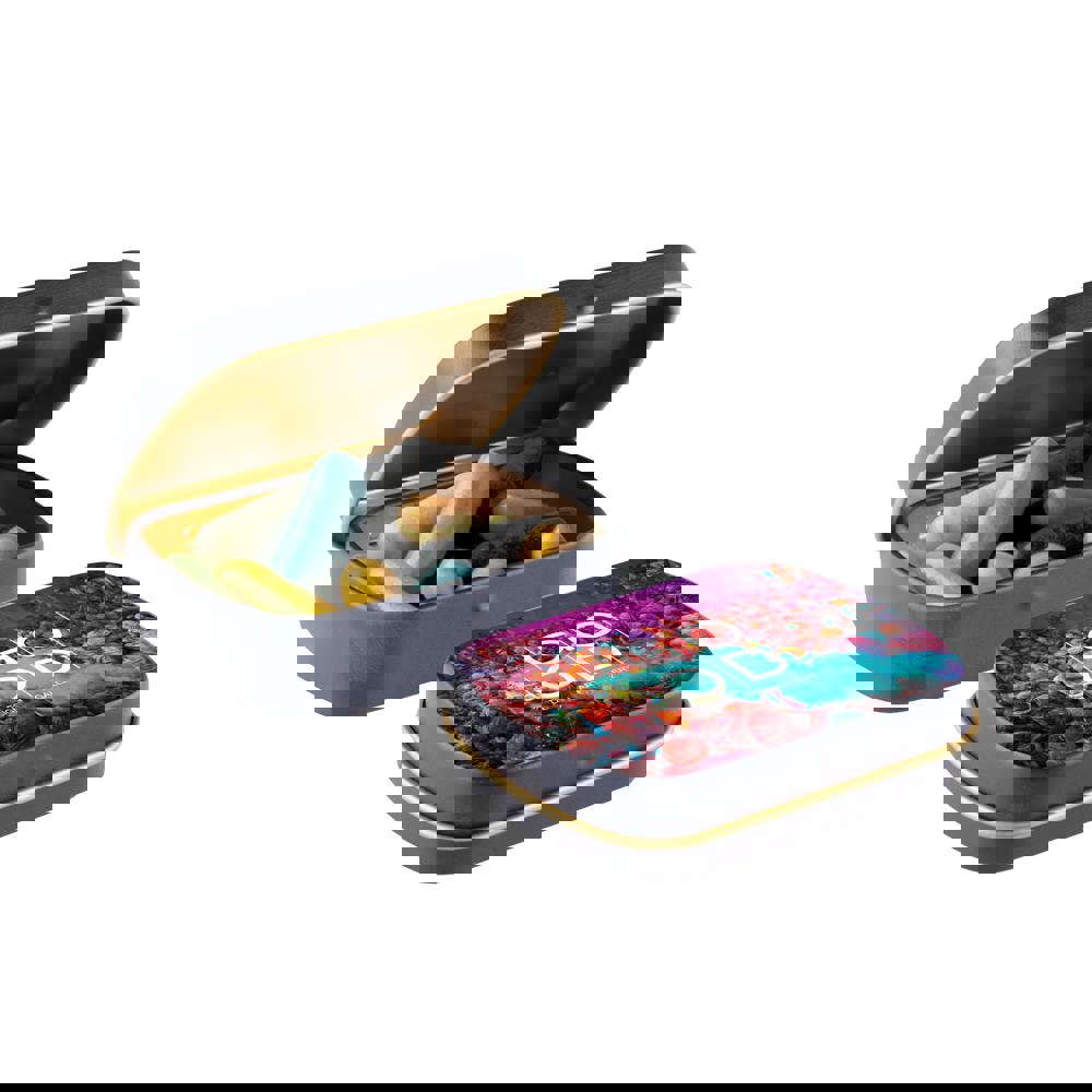 Mini weiße Klappdeckeldose mit ca. 23 Gramm Mini Choco's, vollfarbig bedruckt. Inklusive Inhaltsstoffaufkleber und eingeschweißt.