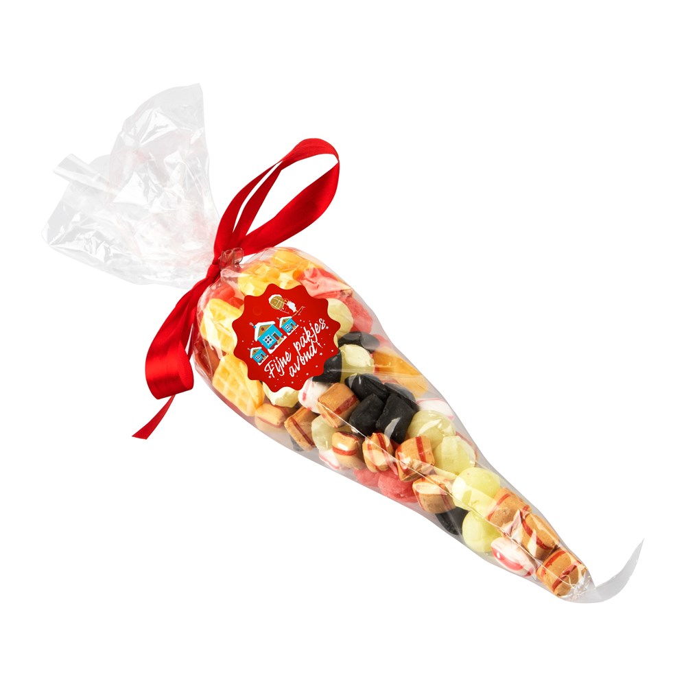 Transparente Kegelbeutel, gefüllt mit ca. 250 Gramm Klassische Holländische Süssigkeiten und vollfarbigem Aufkleber auf einer Seite