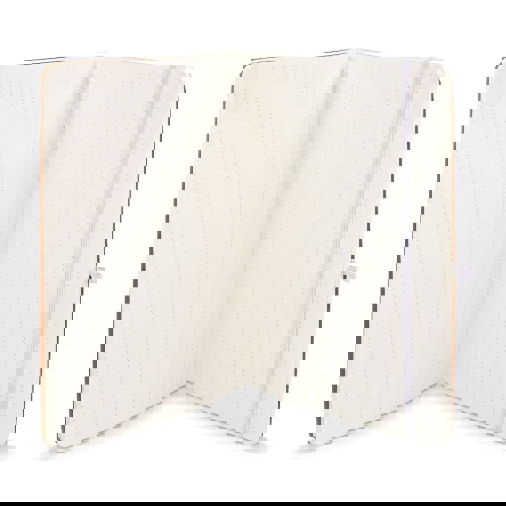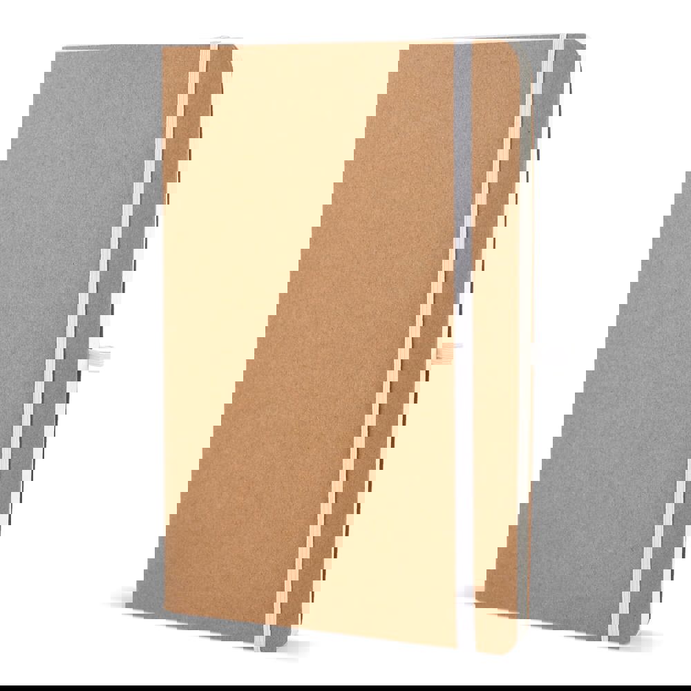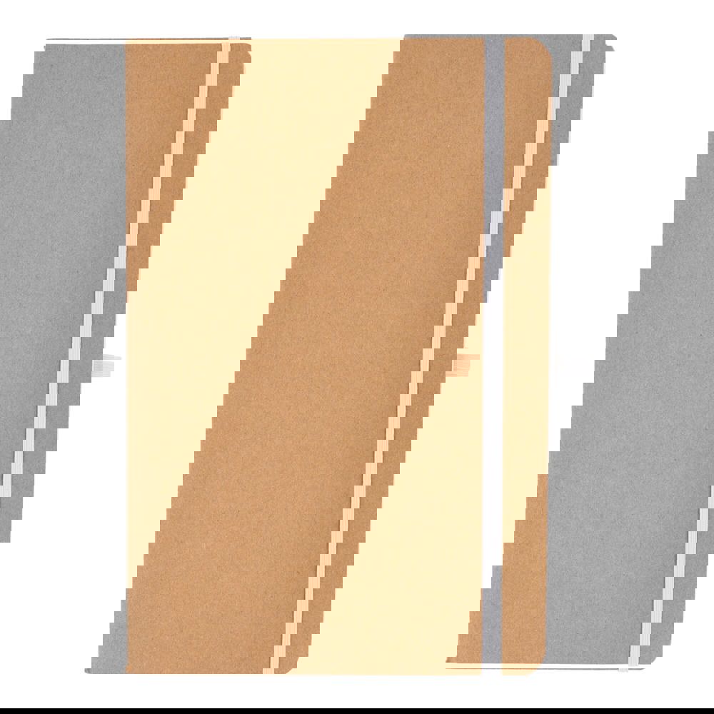 A5-Notizbuch mit weichem Kraftpapiereinband, abgerundeten Ecken, farbigem Gummiverschluss und Stiftschlaufe. Es hat 60 linierte cremefarbene Blätter aus FSC-zertifiziertem Papier. Eine praktische und natürlich wirkende Option für tägliche Notizen.