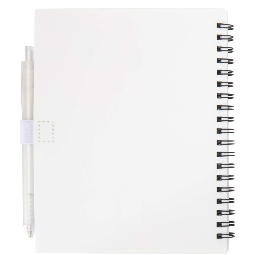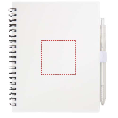 Das Niove Softcover-Notizbuch besteht aus recyceltem Kunststoff und enthält 70 punktkarierte Seiten aus 70 g/m² Papier. Das Notizbuch hat abgerundete Ecken und eine Stiftschlaufe. Notizbuchformat: 140 × 178 mm. Der Kugelschreiber besteht ebenfalls aus recyceltem Kunststoff. Tintenfarbe: Blau. Schreiblänge: 1000 Meter. Schreibspitze: 1,0 mm.