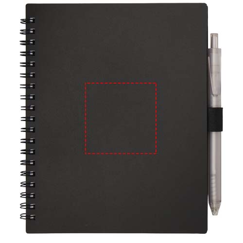 Das Niove Softcover-Notizbuch besteht aus recyceltem Kunststoff und enthält 70 punktkarierte Seiten aus 70 g/m² Papier. Das Notizbuch hat abgerundete Ecken und eine Stiftschlaufe. Notizbuchformat: 140 × 178 mm. Der Kugelschreiber besteht ebenfalls aus recyceltem Kunststoff. Tintenfarbe: Blau. Schreiblänge: 1000 Meter. Schreibspitze: 1,0 mm.