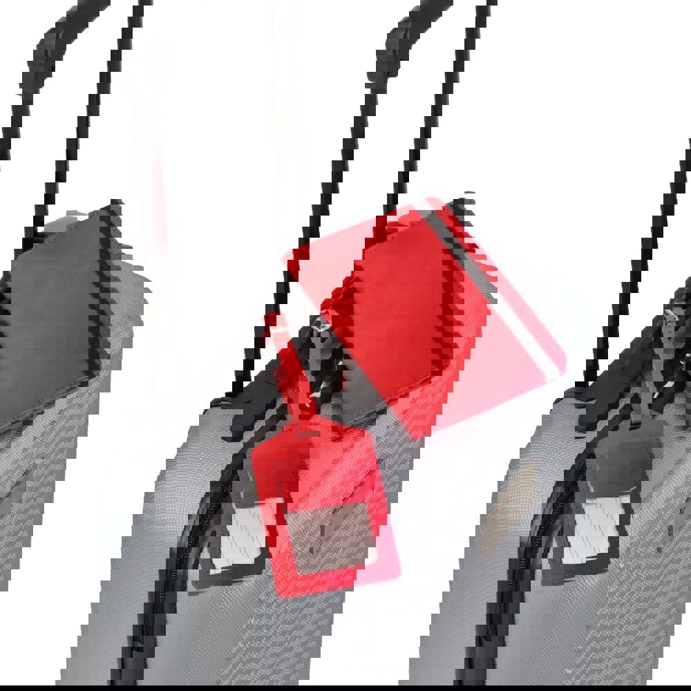 Reiseset mit PU-Reisedokumentetui mit RFID-Schutz, elastischem Verschluss, Platz für Pass, 4 Kreditkarten, 2 SIM-Karten, weitere Fächer (z. B. Bordkarten). Inkl. Gepäckanhänger mit Schnallenriemen und Kontaktkarte (Name, Telefon, Adresse, E-Mail) auf Englisch.