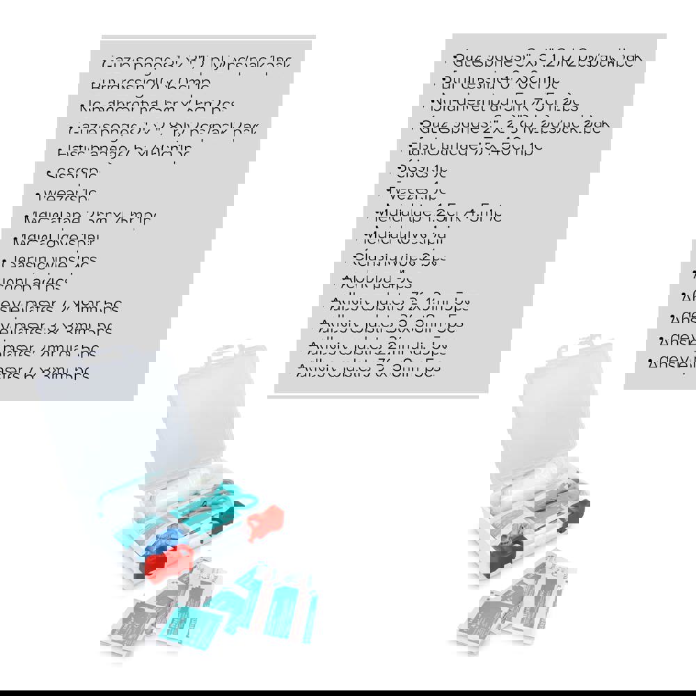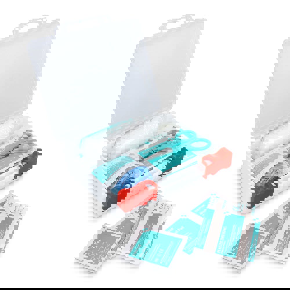 Umfassendes Erste-Hilfe-Set in einem robusten PP-Koffer, entspricht den europäischen Normen. Für den Einsatz zu Hause, im Büro, auf Reisen oder im Freien konzipiert. Bietet eine große Auswahl an Artikeln für die Wundversorgung, Verbrennungen und kleinere Verletzungen. Inhalt: 1 × Mullkompressen 3„ × 3“ 12-lagig (2 Stück/Packung), 1 × Verbrennungsverband 40 × 60 cm, 2 × nicht haftende Kompressen 5 × 7,5 cm, 2 × Mullkompressen 2„ × 2“ 8-lagig (2 Stück/Packung), 1 × elastische Binde 7,5 × 450 cm, 1 × Schere, 1 × Pinzette, 1 × medizinisches Klebeband 1,25 cm × 4,5 m, 1 × medizinische Handschuhe (2 Stück), 2 × Reinigungstücher, 4 × Alkoholtupfer, 5 × Heftpflaster 72 × 19 mm, 5 × Heftpflaster 38 × 38 mm, 5 × Heftpflaster 22 mm Durchmesser, 5 × Heftpflaster 76 × 38 mm.