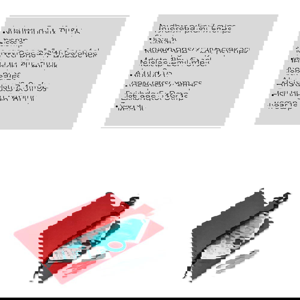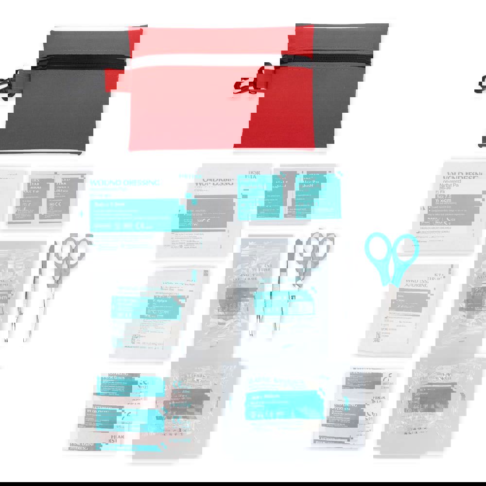 Dieses Erste-Hilfe-Set ist in einer praktischen Tasche aus 300D-Polyester mit Karabinerhaken verpackt und entspricht den europäischen Normen. Es eignet sich ideal für Reisen, Outdoor-Aktivitäten, Sport oder zur Aufbewahrung im Auto oder Rucksack für kleine Notfälle. Kompakt und praktisch, enthält es das Nötigste zur Versorgung von Schnittwunden, Schürfwunden und kleineren Verletzungen. Inhalt: 2 × nicht haftende Kompressen 5 × 7,5 cm, 1 × Schere, 1 × Packung mit 5 Vlieskompressen 2„ × 2“ 4-lagig, 1 × medizinisches Klebeband 1,25 cm × 4,5 m, 2 × Alkoholtupfer, 5 × Heftpflaster 72 × 19 mm, 1 × elastische Kreppbinde 5 × 450 cm, 1 × Pinzette.