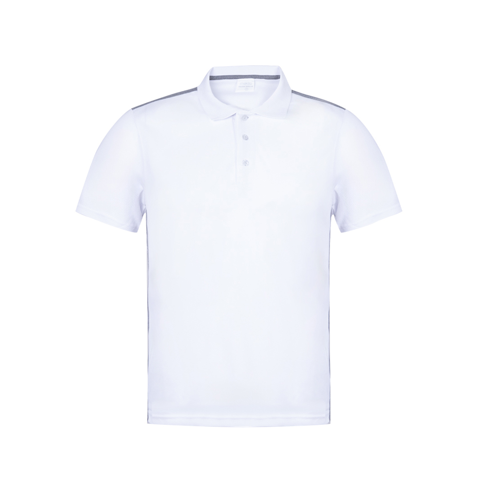 Tecnic Polohemd für Erwachsene aus atmungsaktivem Polyester 180g/m2. In einem eleganten zweifarbigen Design, mit Körper in weißer Farbe und Details in grau. Erhältlich in den Größen S, M, L, XL, XXL. Weiße Farbe speziell für den Sublimationsdruck hergestellt.