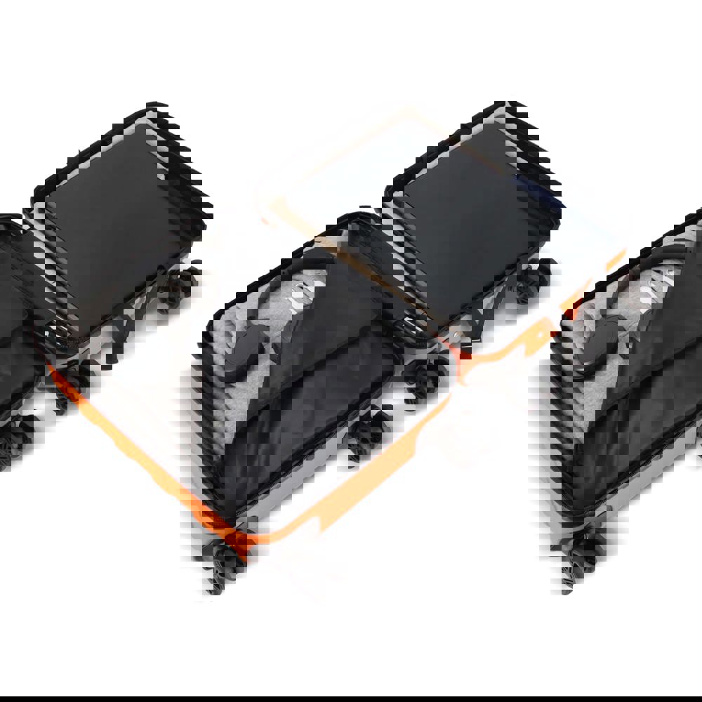 Dieser Kabinentrolley vereint Stauraum und Benutzerfreundlichkeit. Er passt in die meisten Flugzeugfächer und hält wichtige Utensilien griffbereit. Mit vier Lenkrollen, Zahlenschloss und Handyhalterung im Griff macht er das Warten am Flughafen, Bahnhof oder Bahnsteig deutlich angenehmer.