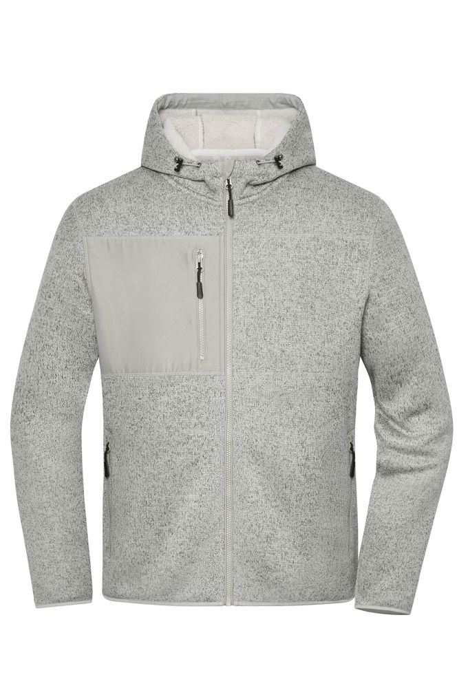 Weiche, wärmende Qualität in Melange-Optik Außenseite Strick-Optik, Innenseite flauschiges Sherpafleece Angeschnittene und regulierbare Kapuze Kontrastfarbiger Webstoffbesatz an Kapuzenöffnung innen 2 Seitentaschen mit Reißverschluss, 1 Brusttasche aus kontrastfarbigem Webstoff mit Reißverschluss 2 große Innentaschen Durchgehend hinterlegter Reißverschluss mit Kinnschutz Kontrastfarbige Paspel an allen Reißverschlüssen Reißverschlüsse: YKK 1/2 Oberweite: 54 cm 1/2 Saumweite: 51 cm Länge ab Schulter: 71 cm Ärmel Länge: 66 cm OEKO-TEX® Standard 100 (15.0.70467) Kapuze YKK - Reißverschluss