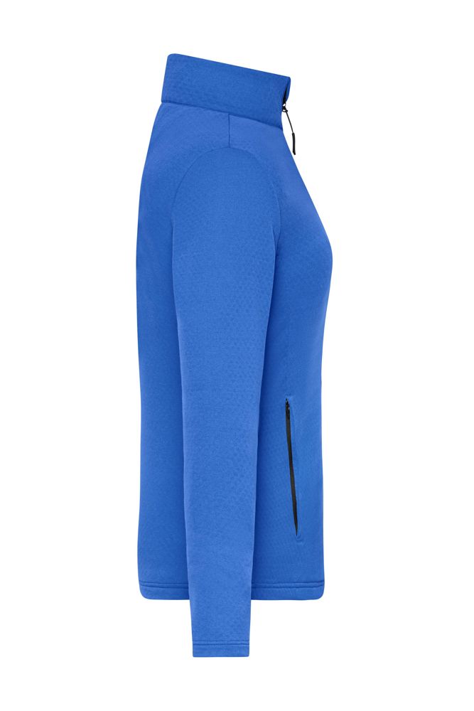 Angenehm weiche, bi-elastische Qualität Außenseite glatt, Innenseite mit strukturierter Fleeceoptik Durchgehend unterlegter Reißverschluss mit Kinnschutz 2 seitliche Taschen mit Reißverschluss Kontrastfarbige Reißverschlüsse Stehkragen JN1387: leicht tailliert 1/2 Oberweite: 44 cm 1/2 Taillenweite: 39 cm 1/2 Saumweite: 44 cm Länge ab Schulter: 59 cm Ärmel Länge: 60 cm GRS Standard Stehkragen