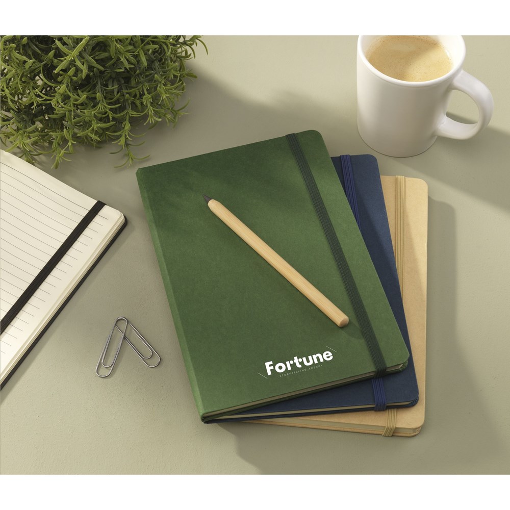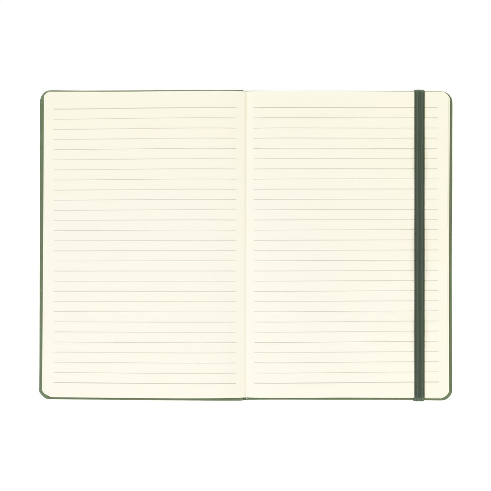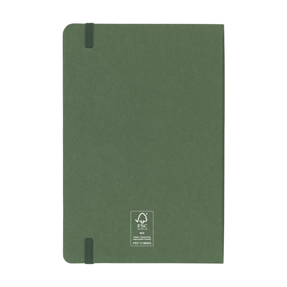 A5-Notizbuch mit Hardcover aus FSC Mix zertifiziertem Karton. Das Notizbuch umfasst ca. 80 Blatt/160 Seiten cremefarbenes, liniertes FSC Mix zertifiziertes Papier (70 g/m²). Mit gebundenem Buchrücken und praktischem Gummiverschluss.