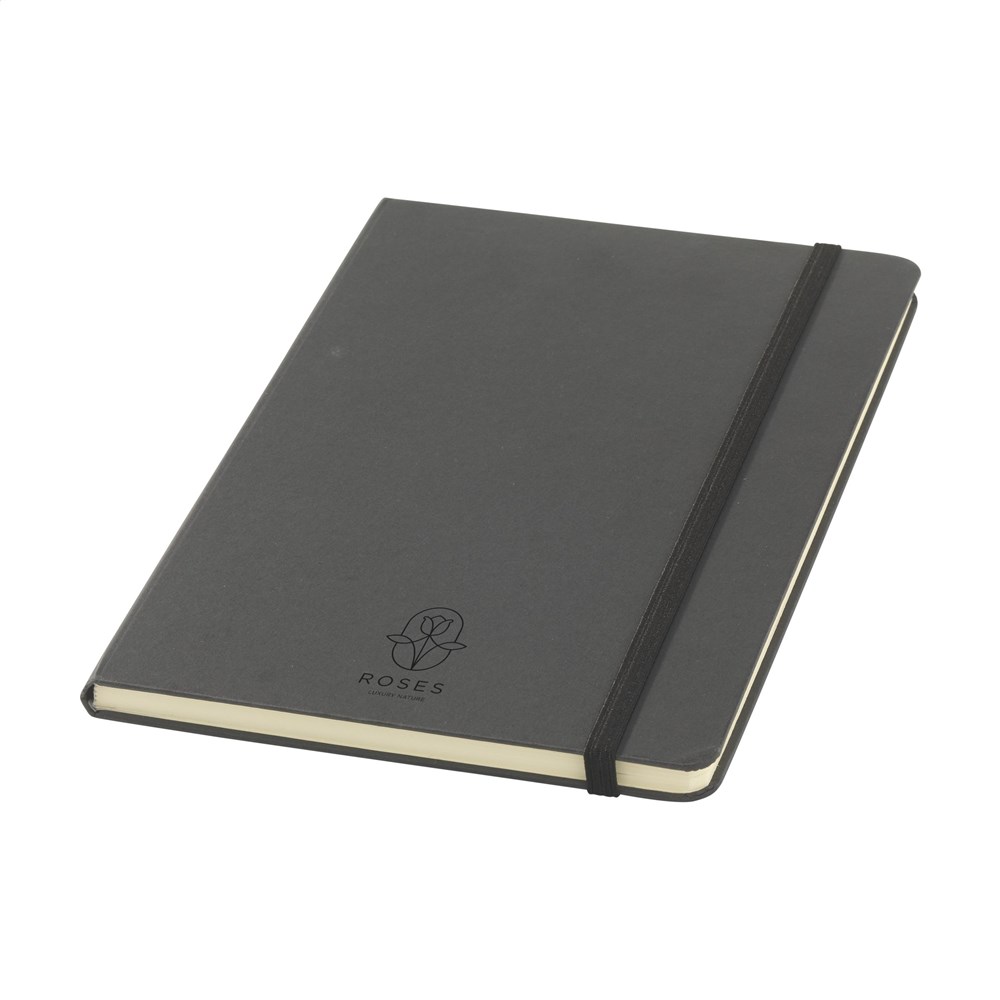 A5-Notizbuch mit Hardcover aus FSC Mix zertifiziertem Karton. Das Notizbuch umfasst ca. 80 Blatt/160 Seiten cremefarbenes, liniertes FSC Mix zertifiziertes Papier (70 g/m²). Mit gebundenem Buchrücken und praktischem Gummiverschluss.