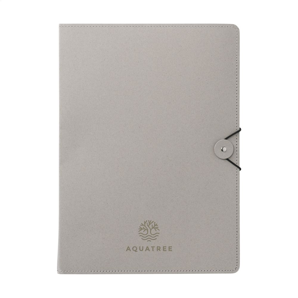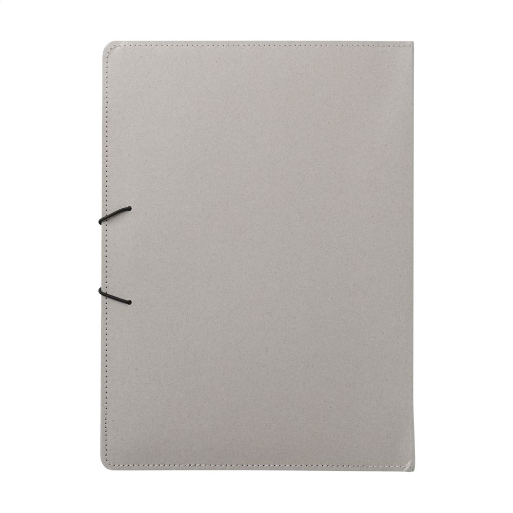 Moderne Schreibmappe/Dokumentenmappe aus hochwertigem, stabilem, FSC 100% zertifiziertem Karton (650 g/m²). Mit 2 Einsteckfächern auf der Innenseite. Das rechte Einsteckfach ist für den mitgelieferten Schreibblock mit ca. 30 Blatt liniertem, FSC 100% zertifiziertem Papier (70 g/m²) vorgesehen. Geeignet für A4-Dokumente. Der Ordner ist rundum schön vernäht und hat einen auffälligen, elastischen Verschluss. Diese Mappe schützt Dokumente und eignet sich für geschäftliche, studienbezogene oder private Zwecke.