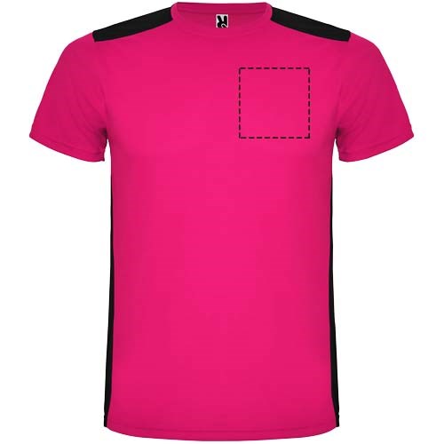 Funktions-T-Shirt aus atmungsaktivem Stoff. Rundhalsausschnitt. Kombination aus zwei Polyestergeweben im Rücken- und Schulterbereich. Polyester Bienenwabe Vorne und 3D-Netz Polyester auf Schulter und Rücken. Material ist feuchtigkeitabsorbierend. Ziernähte auf den Schultern und Seiten. Schnitt mit verlängertem Rückenteil. Abnehmbares Etikett.