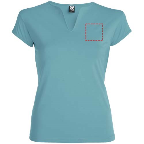 Tailliertes T-Shirt V-Ausschnitt vorne. Halbe Ärmel und Seitennähte. Hochwertiges Material für ein weiches und angenehmes Tragegefühl. Herausnehmbares Etikett. Das Modell ist 179 cm groß und trägt Größe S.