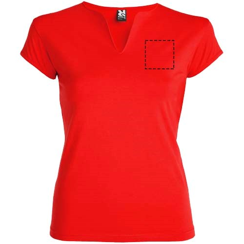 Tailliertes T-Shirt V-Ausschnitt vorne. Halbe Ärmel und Seitennähte. Hochwertiges Material für ein weiches und angenehmes Tragegefühl. Herausnehmbares Etikett. Das Modell ist 179 cm groß und trägt Größe S.