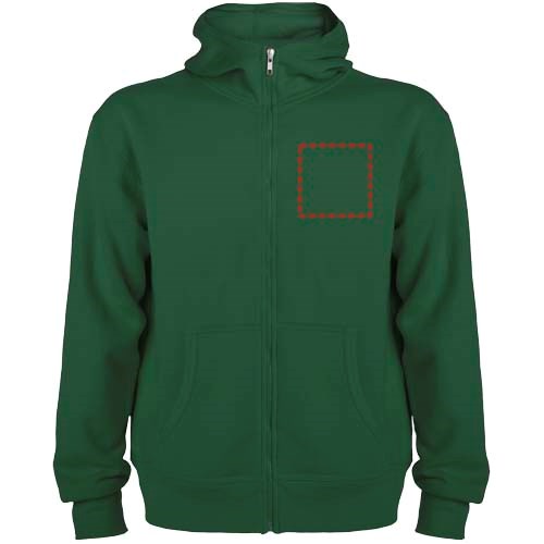 Sweatjacke mit Kapuze, hohem Halsausschnitt und durchgehendem Reißverschluss. Gerippte Details an Kapuze und Taschenpaspeln. Tasche im Känguru-Stil. 2×2 Rippenstrick an Ärmeln und Taille. Herausnehmbares Etikett. Das Modell ist 184 cm groß und trägt Größe L.