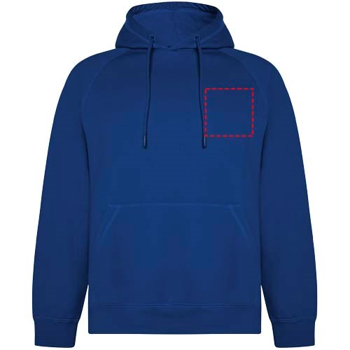 Unisex-Kapuzenpullover aus Bio-Baumwolle und recyceltem Polyester. Tasche im Känguru-Stil. Kapuze mit einfachem Jersey gefüttert. Verstellbarer Kordelzug und gestickte Ösen. Bündchen und Saum aus 2×1-Rippstrick. Herausnehmbares Etikett. Einzelverpackung aus recyceltem Material. Das männliche Modell ist 185 cm groß und trägt Größe L, das weibliche Modell ist 168 cm groß und trägt Größe S.