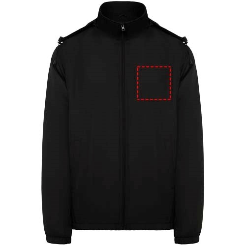 Leichte, wasserabweisende Jacke. Hoher Kragen und einrollbare, verstellbare Kapuze. Innenfutter aus Microfleece. Front-Reißverschluss und Kinnschutz. Elastische Ärmelbündchen. Zwei Seitentaschen mit Reißverschluss. Innere Brusttasche links. Herausnehmbares Etikett. Wasserabweisend. Winddicht. Das männliche Modell ist 184 cm groß und trägt Größe L, das weibliche Modell ist 174 cm groß und trägt Größe S.