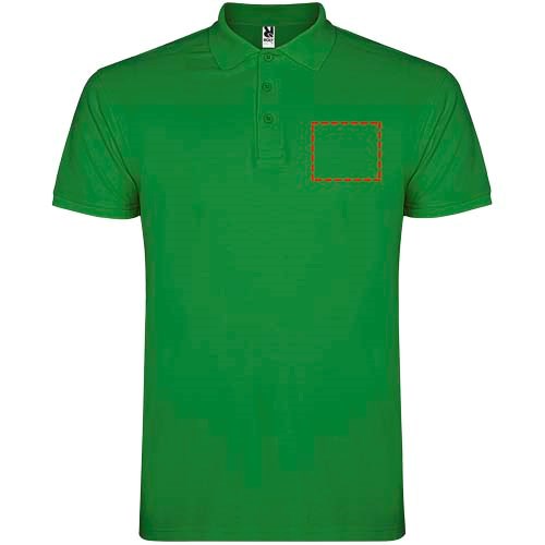 Kurzärmeliges Poloshirt für Kinder. Verstärkte und verdeckte Nähte am Innenkragen. 1x1 Rippstrickbündchen an Ärmeln und Kragen. Seitennähte. 3-Knopfleiste und Seitenschlitze. Optionale Tasche. Herausnehmbares Etikett. Das Modell ist 124 cm groß und trägt Größe 5/6.