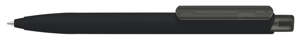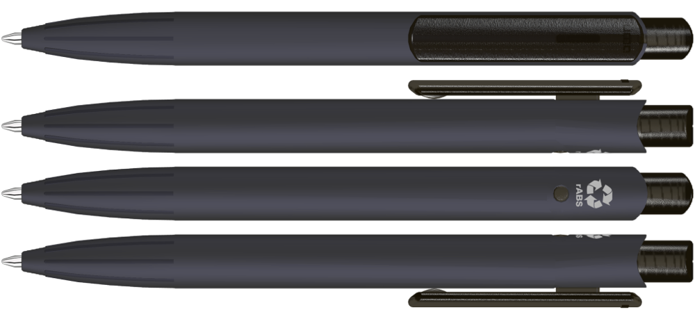 Druckkugelscheiber mit gummiertem Gehäuse aus recyceltem ABS-Kunststoff mit transparent gefrostetem Clip und Drücker. Eingelassene Griffzone.