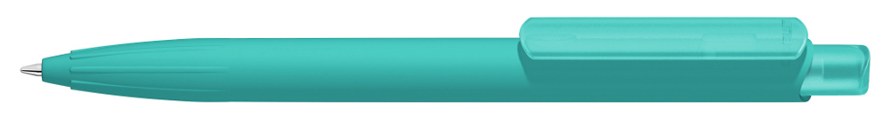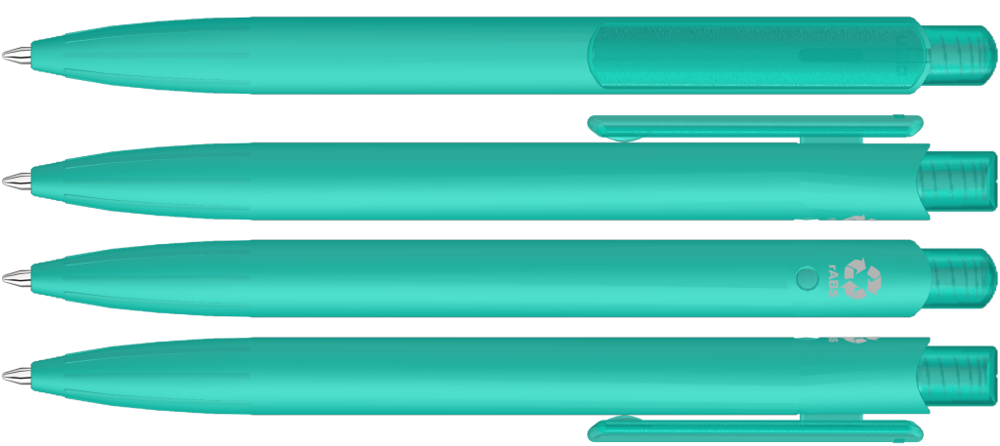 Druckkugelscheiber mit gummiertem Gehäuse aus recyceltem ABS-Kunststoff mit transparent gefrostetem Clip und Drücker. Eingelassene Griffzone.