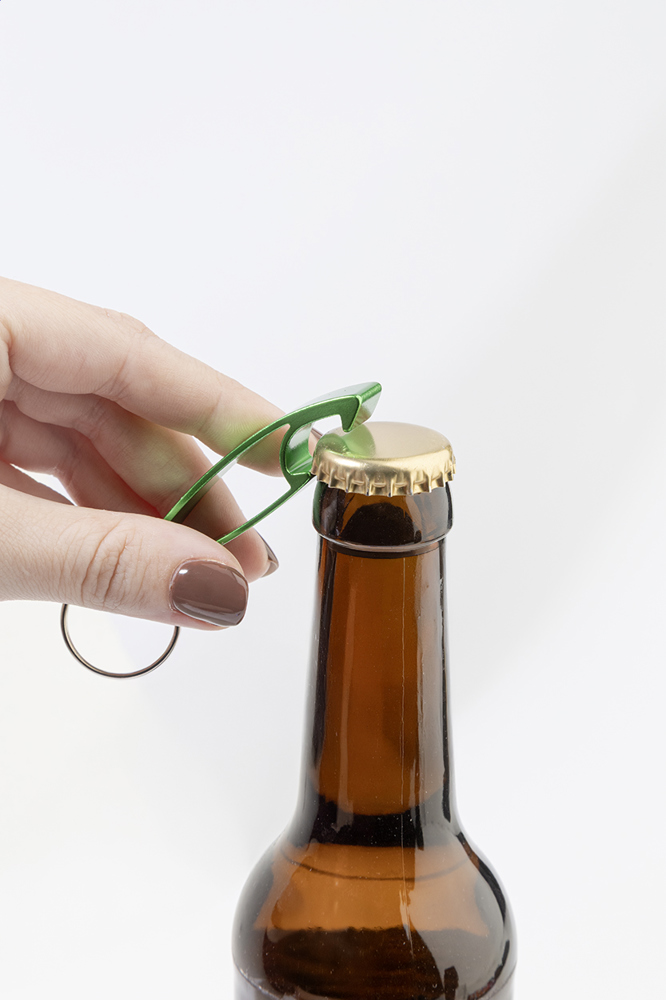 Flaschenöffner aus recyceltem Aluminium mit Schlüsselring aus Metall. mehr