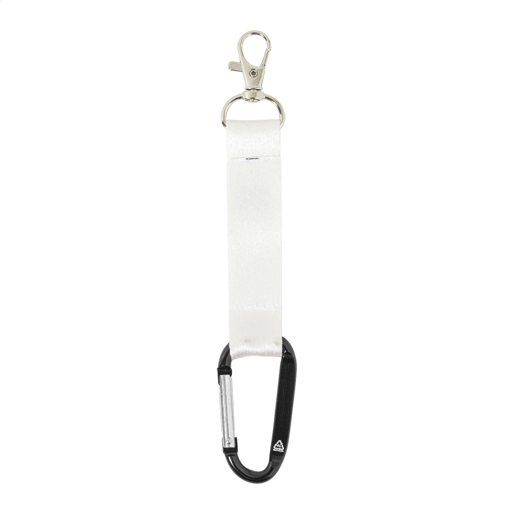 Individueller Mini-Schlüsselanhänger aus RPET-Polyester inkl. beidseitigem Sublimationsdruck. Mit kleinem Metallkarabiner und großem Karabinerhaken aus recyceltem Aluminium. Mindestmenge: 100 Stk.