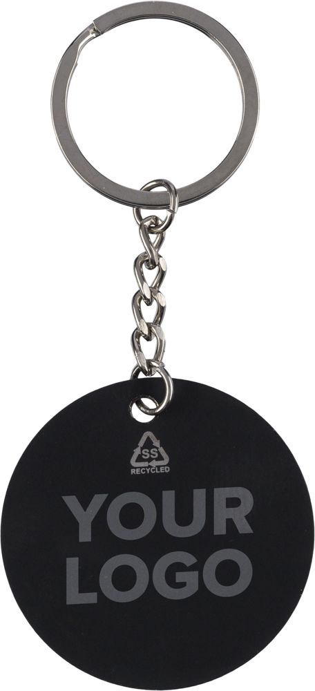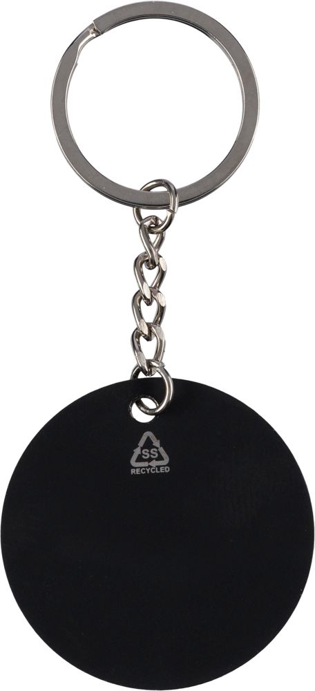 Recycelter, gummierter Schlüsselanhänger aus Edelstahl mit Metallring im runden Fußball-Design. Mit eingraviertem Recycling-Logo, das nach der Gravur einen glänzenden Spiegeleffekt aufweist. Einzeln verpackt in einem Kraftpapier-Umschlag.