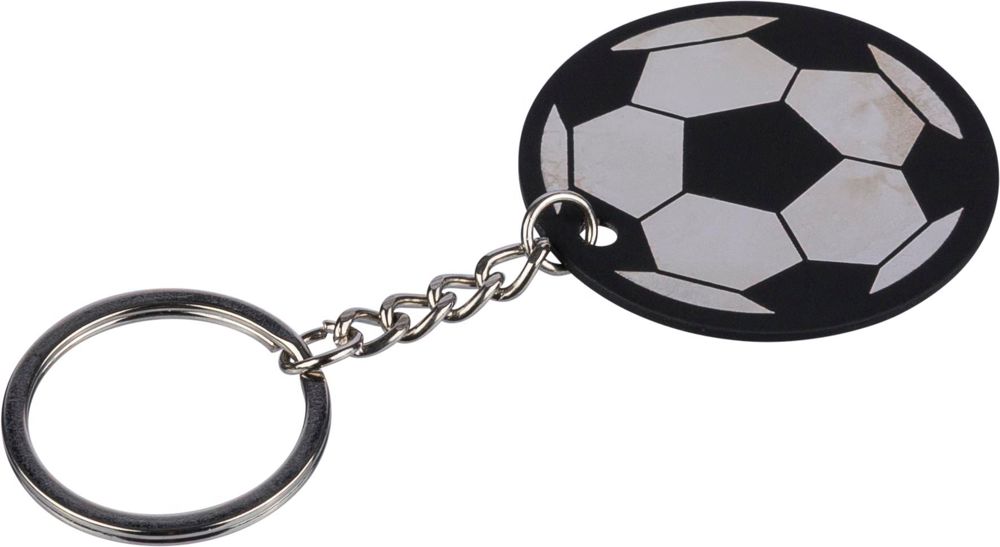 Recycelter, gummierter Schlüsselanhänger aus Edelstahl mit Metallring im runden Fußball-Design.... mehr