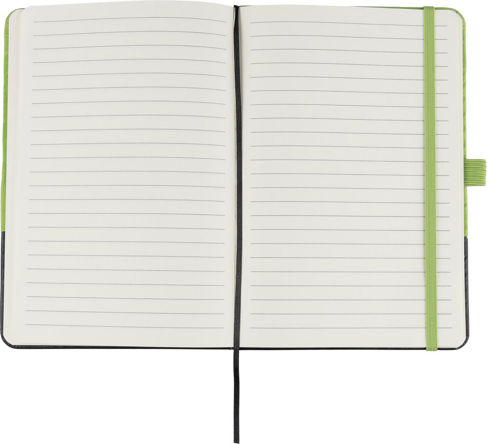 A5-Notizbuch aus rPET-Polyester mit einer teilweise laserbaren PU-Vorderseite. Nach der Gravur passt sich die Farbe dem rPET-Gewebe an. Es verfügt über 80 linierte Seiten (70 g/m²), ein Gummiband, eine Stiftschlaufe und ein Lesebändchen. Der untere PU-Bereich ist für die Gravur vorgesehen, um die passende Farbe zu erhalten.