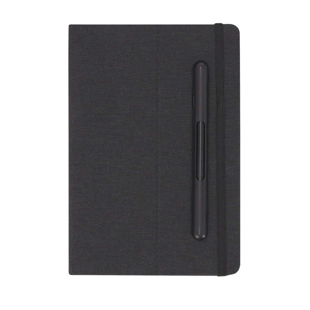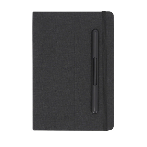 Notepad-Ständer mit starren Umschlüpfen aus 600D RPET. Vielseitige Unterstützung integriert in das Cover. Enthält den ewigen Bleistift. Enthält 96 Innenplatten mit Streifen. Sie hat einen elastischen Verschluss. Mit RPET-Logo.