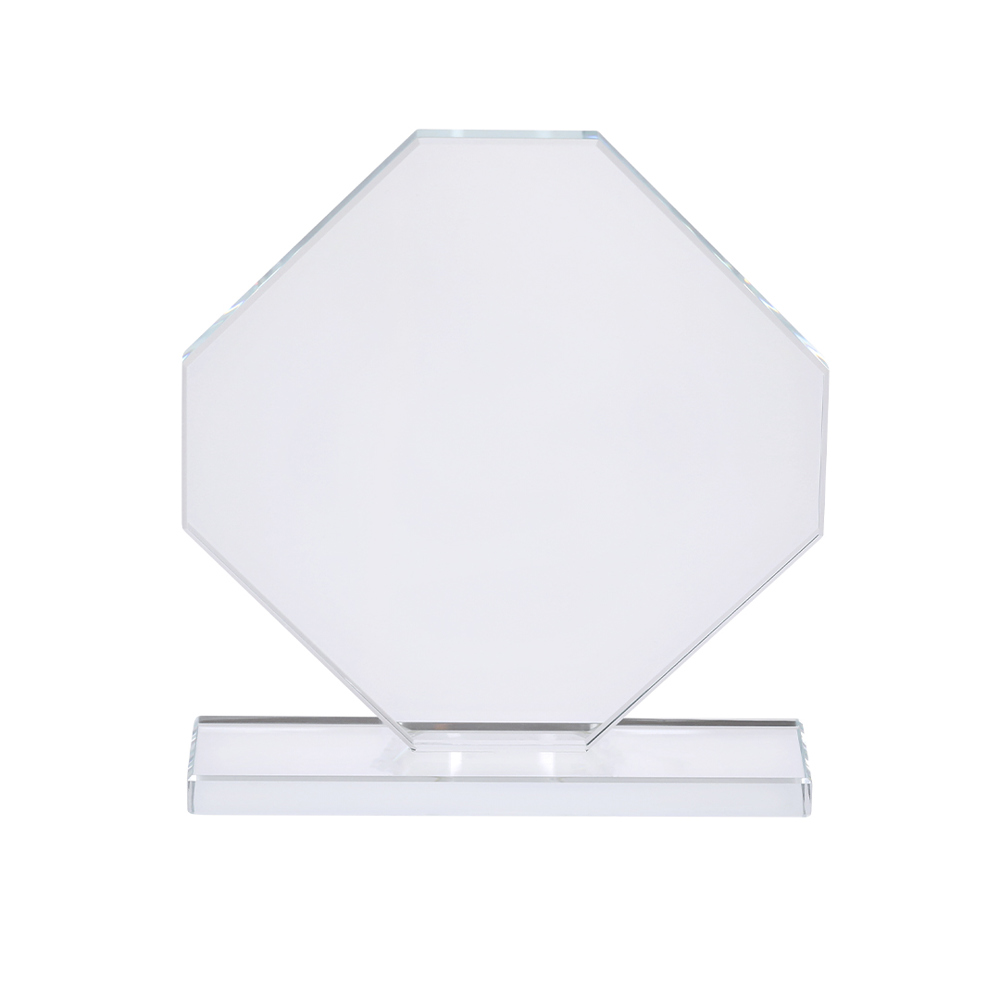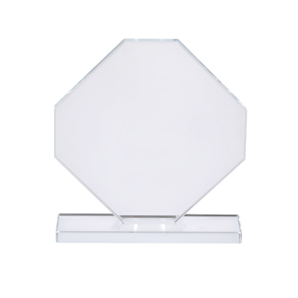 Trophäenplatte aus dickem Glas mit elegantem achteckigem Design und Stand. Ideal für personalisierte Geschenke, Anerkennungen, Auszeichnungen und Dekorationen. Präsentiert in einem individuellen Schutzgehäuse in elegantem Design.