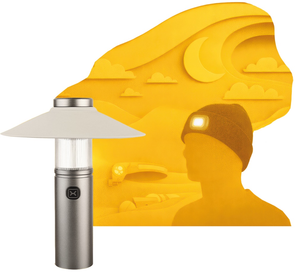 Zum Aufstellen, aufhängen oder in der Hand tragen 4-in-1 LED und SMD Multifunktionsleuchte mit Magnet, Aufhängebügel und Silikonschirm. Batterie: 1800mAh. Maße (BxHxT) ohne Schirm: 32 x 32 x 138 mm. Schirmdurchmesser: 116 mm. Gewicht: 146 g. Material: Aluminium, PC, Silikon. Kunststofffreie Einzelverpackung.