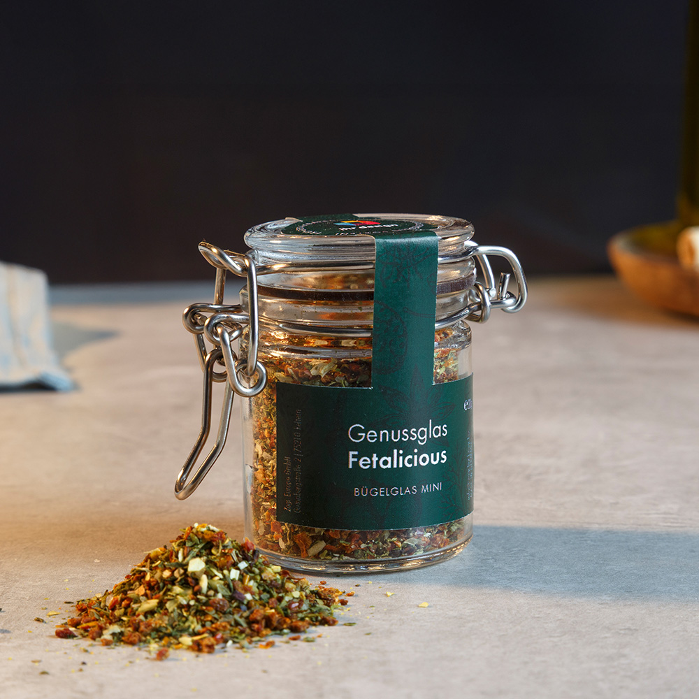 Das formschöne, wiederverwendbare Bügelglas wird mit ausgewählten Gewürzen befüllt und eignet sich ideal als hochwertiger Genussgruß.