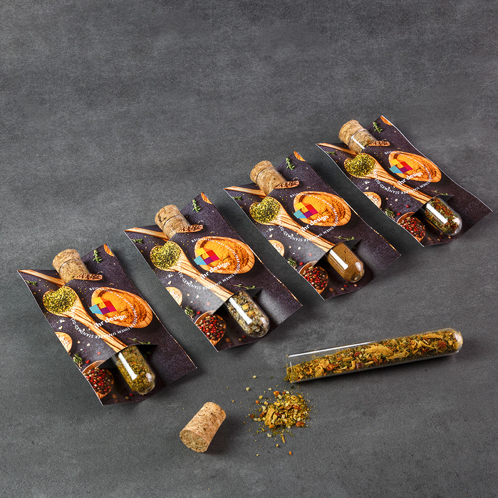 Die Aromaröhre – Gewürz 1er präsentiert ausgewählte Gewürze in einem hochwertigen, transparenten Röhrchen. Der Inhalt steht im Mittelpunkt und wird durch eine individuell gestaltbare Einsteckkarte ergänzt, die Raum für Markenbotschaften oder Produktinformationen bietet. Die Aromaröhre eignet sich ideal als Give-away, Mailingbeilage oder kleine Aufmerksamkeit für Kunden und Mitarbeitende und verbindet Genuss mit einer wertigen, zeitlosen Verpackung.