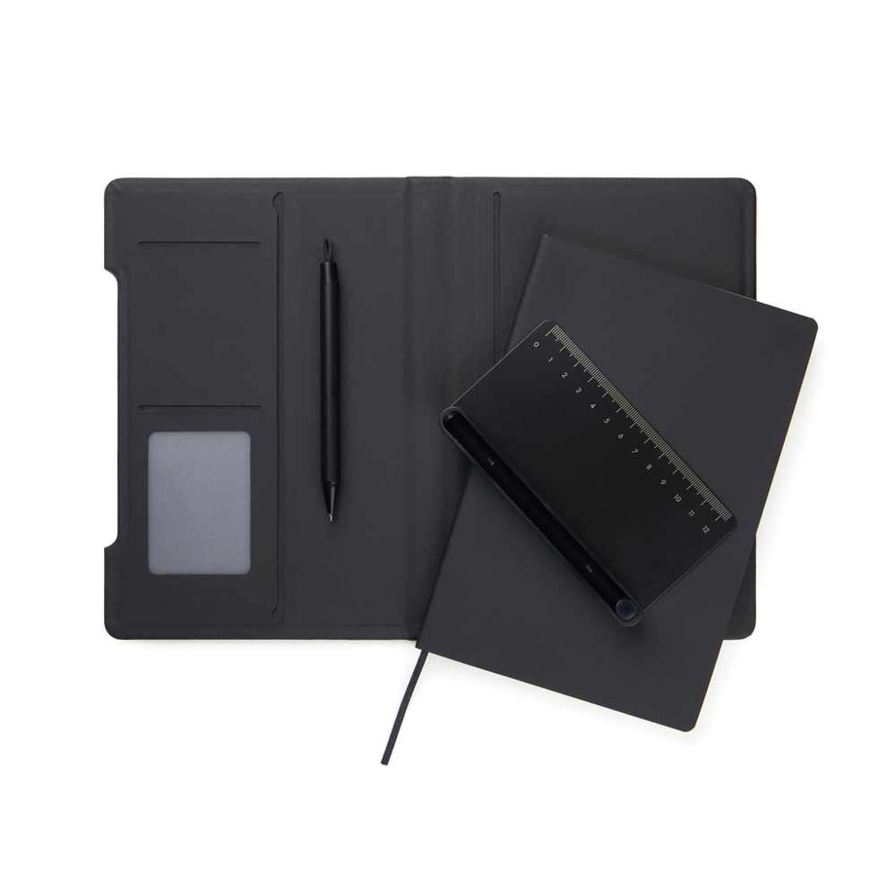 Entdecken Sie das ultimative multifunktionale Notizbuch. Diese intelligente 4-in-1-Lösung vereint Funktionalität, Flexibilität & Design in einem. Hergestellt aus RCS-zertifiziertem Recyclingpapier mit einem Einband in klassisch matter PU-Beschichtung, ist es ebenso optisch ansprechend wie funktional. Ein magnetisches Lineal dient sowohl als Lineal als auch als Stifthalter und enthält einen passenden Kugelschreiber mit blauer Tinte. Der Stifthalter lässt sich leicht in einen in die Struktur des Notizbuchs integrierten Handyhalter verwandeln. Im Inneren befinden sich Kartenhalterklappen und ein leicht austauschbares Notizbuch für langlebigen Gebrauch. Das Notizbuch enthält 80 Blatt / 160 linierte Seiten und bietet viel Platz für Notizen, Planungen und Ideen. Es ist der perfekte Begleiter für Besprechungen, Reisen oder die tägliche Organisation. Gesamtanteil an recyceltem Material: 70% bezogen auf das Gesamtgewicht des Artikels. Zertifiziert durch Control Union, CU1162221.
