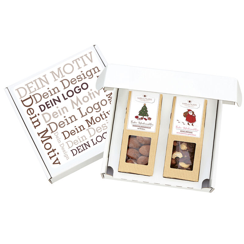 Ab 100 Stück mit Ihrem Etikett im 4c Druck auf dem Deckel des Geschenkkartons, ab 1.000 Stück vollflächig bedruckt im Offsetdruck: Der Geschenkkarton ist portooptimiert und kann ohne Umkarton versendet werden. Wählen Sie aus den beliebtesten Weihnachten-Snacks: Gebrannte Mandeln, Trüffelmandeln mit Kakao und Haselnusskerne mit Vollmilch und Zimt. Viele weitere Snack-Kompositionen auf Anfrage. Mit Liebe konfektioniert in Deutschland. Sie suchen eine andere Größe? Dieses Premium Präsent ist auch mit 1, 3 oder 4 Faltschachteln erhältlich.