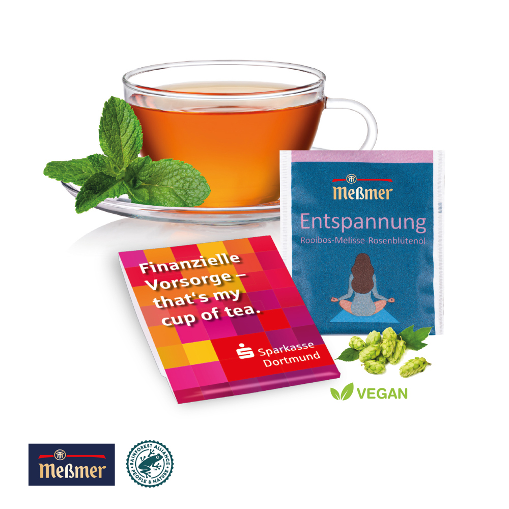 Verschenken Sie Tee-Genuss! Das Tee-Briefchen verwöhnt mit hochwertigem Meßmer-Tee. Ideal als kleines Präsent, für Messen, Veranstaltungen, Mailings oder als Beilage für Rechnungen und Warensendungen. Produktdetails: Ein Teebeutel von Meßmer im Werbebriefchen. Nachhaltigkeit: Für jede Bestellung mit uns wird ein Baum über GROW MY TREE gepflanzt. Wir verwenden FSC® zertifizierten Karton aus nachhaltiger Forstwirtschaft und anderen kontrollierten Quellen.
