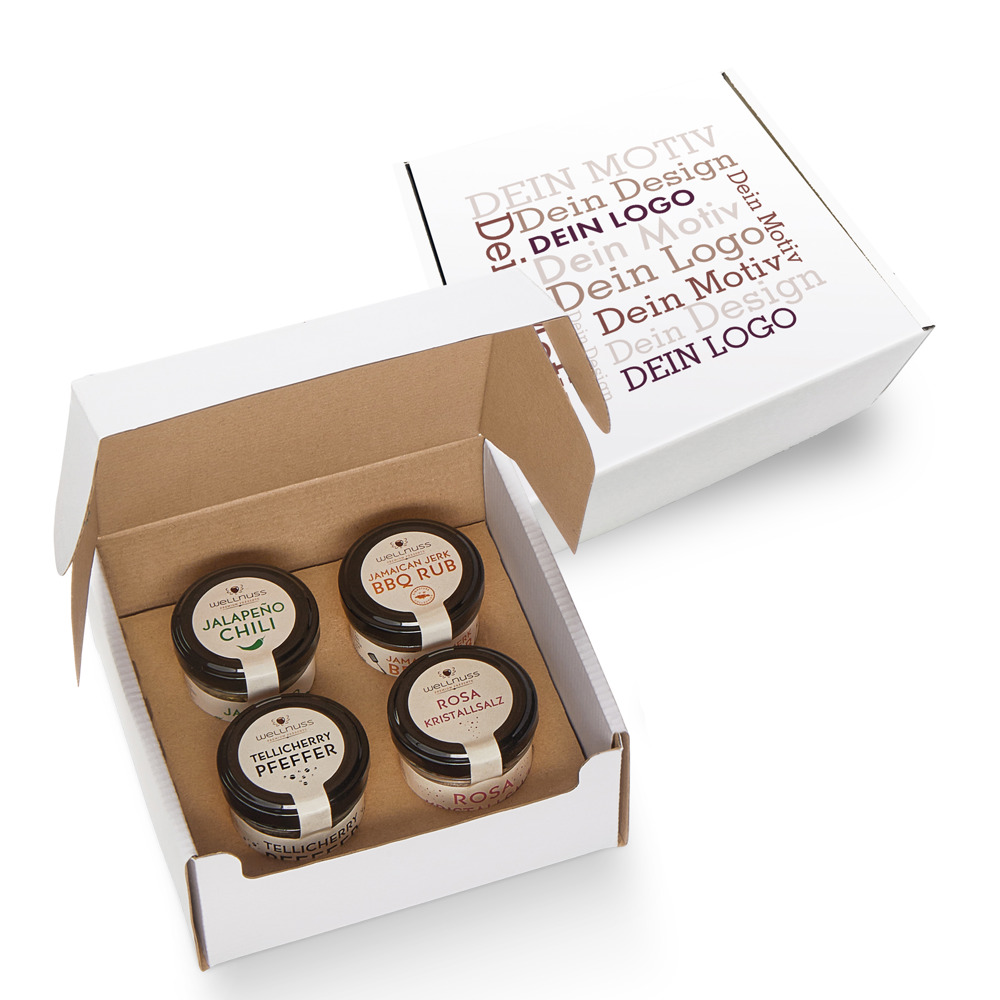 Ab 100 Stück mit Ihrem Etikett im 4c Druck auf dem Deckel des Geschenkkartons, ab 1.000 Stück vollflächig bedruckt im Offsetdruck: Verschenken Sie Gourmet Gewürze mit Premium Zutaten ohne künstliche Zusatzstoffe, 100 % plastikfrei verpackt und mit Liebe konfektioniert in Deutschland. Sie suchen eine andere Größe? Dieses Premium Präsent ist auch mit 2 oder 3 Gläsern erhältlich.