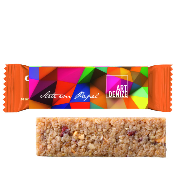 Corny Haferkraft Riegel im Werbeschuber aus weißem Karton, individuell bedruckt. Inhalt: 1 Corny Haferkraft Riegel mit mind. 49% Vollkorn, Sorte Mandel-Karamell, 35 g