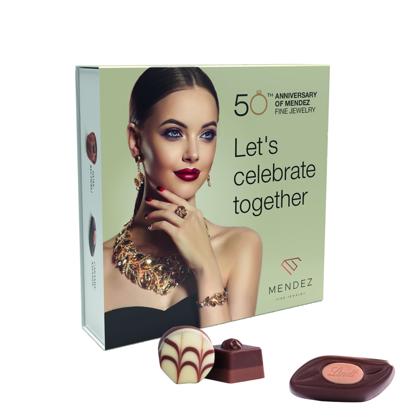 Lindt Mini Pralinés in Pralinenschachtel, Standard-Werbeschuber aus weißer Kartonage, individuell bedruckt. Inhalt: 9 Lindt Mini Pralinés: Coeur a l'orange, Macchiato Stern, Caramel Amande, Vollmilch mit Krokant, Marc de Champagne Trüffel, 44 g