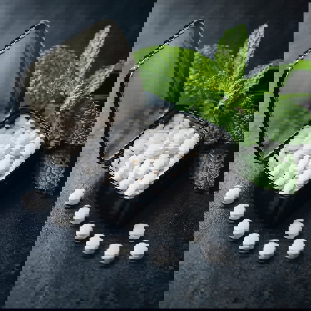 Quadratische Pfefferminzdose, gefüllt mit 23g holländischer Pfefferminzbonbons. Nicht zuckerfrei. mehr